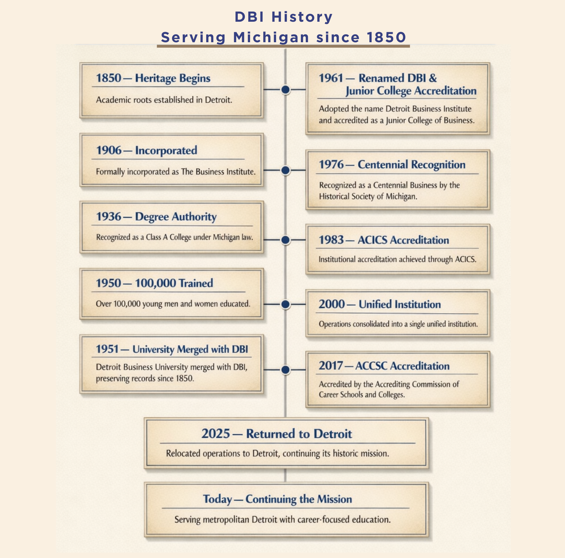 Detroit Business Institute’s heritage traces to 1850, establishing one of Michigan’s longest-standing traditions in career-focused education. Through mergers, expansion, accreditation milestones, and strategic consolidation, DBI has preserved a continuous legacy of workforce development and institutional resilience.